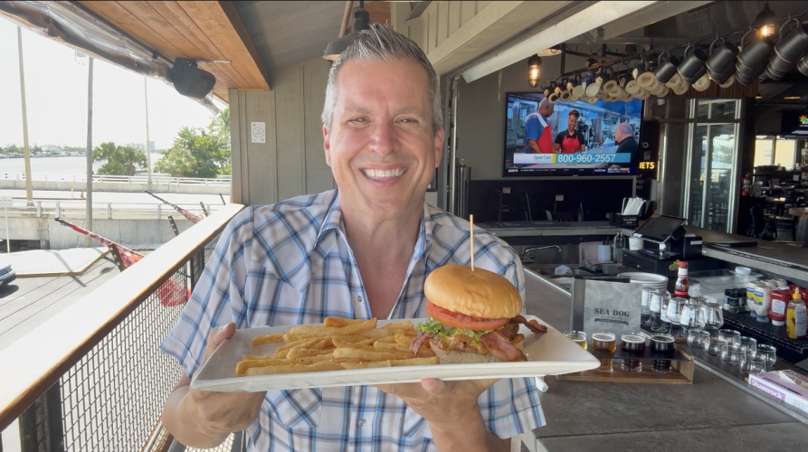 Sea Dog Brewing Co. in Treasure Island has a particularly impressive entry: a hot honey ranch chicken and bacon sandwich plus a flight of beer.