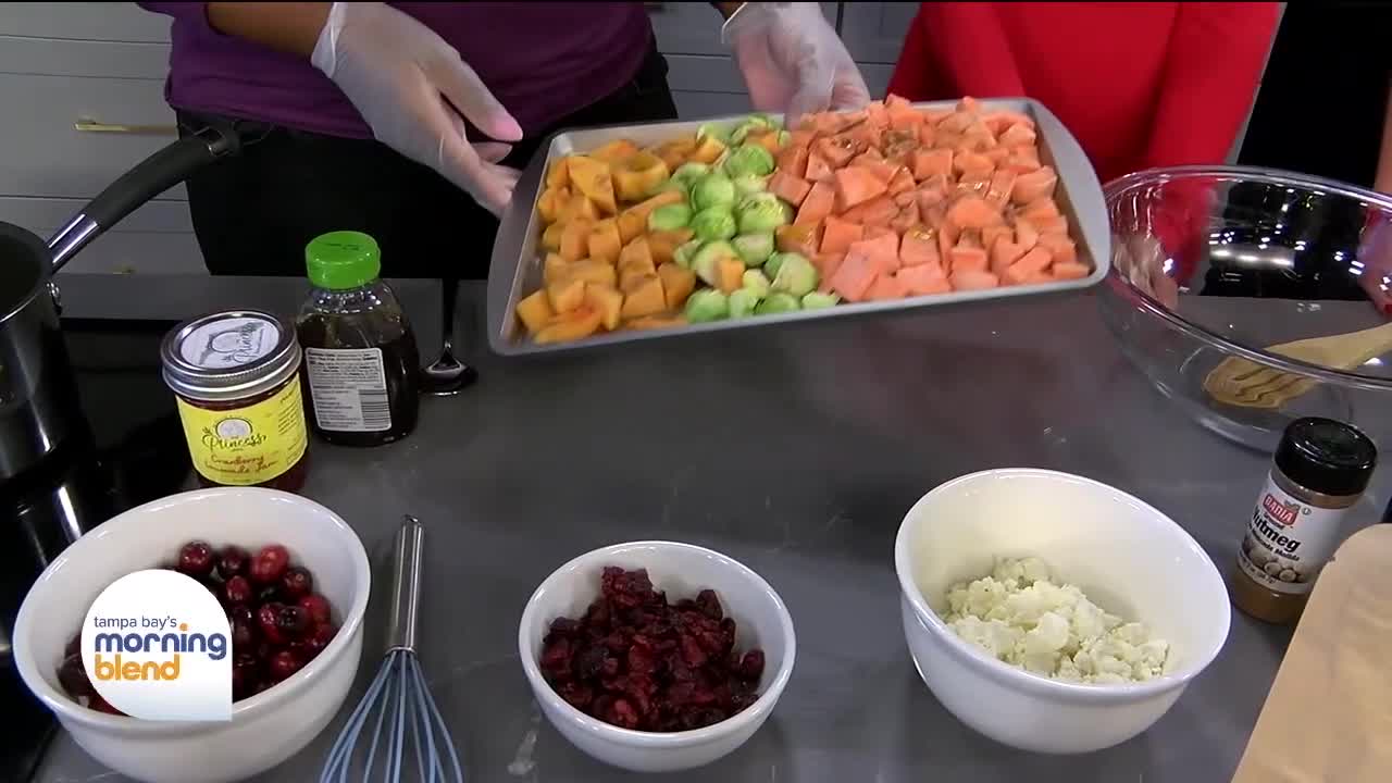 Cranberry-Glazed Roasted Butternut Squash, Brussels Sprouts, and Sweet Potato Salad with Cranberries and Goat or Feta Cheese
