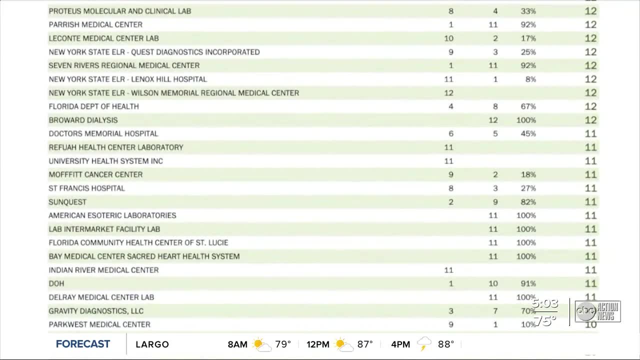 LabCorp is in second place for private labs providing the most results for Floridians, and they are reporting an average wait of four to six days, which is the wait time after the lab receives the collection kit from the testing site.