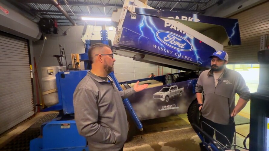 Kevin Gibson and Tyler Urba work in a cold business, maintaining ice at AdventHealth Center Ice in Wesley Chapel.