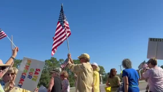 In Largo, protesters lined both sides of Bay Drive and Seminole Boulevard, many holding handmade signs and waving American flags. Participants said they came out to show solidarity and demand a return to what they called compassion and democratic values.