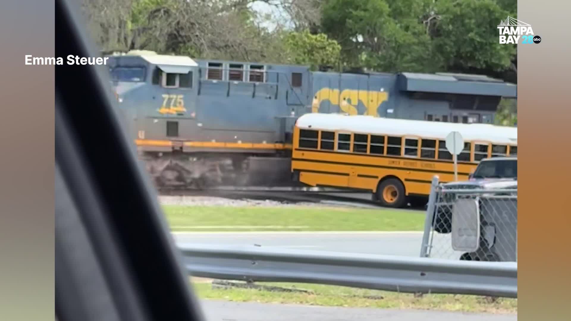 Video from a bystander shows the school bus with 29 children and an adult on board crossing the train tracks and being clipped in the back by the crossing train. Lights are seen flashing in the video.