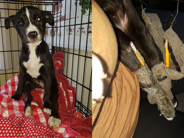 Pencils imbedded in legs of paralyzed puppy
