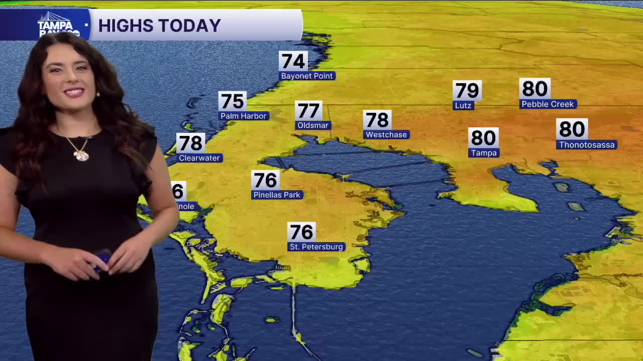 TAMPA — Good Wednesday morning Tampa Bay! It is a mild start to the morning with temps in the 60s with mostly cloudy skies and some fog. Low clouds hang around till mid-morning before the full sun comes out shining. Highs approach the low 80s. Closer to sunset comes our next cold front. This could bring some clouds, breezy winds, and a few showers/sprinkles later on tonight into early Thursday morning. This will bring much cooler air with it as well. Can't rule out a few coastal sprinkles throughout the day on Thursday, but the majority of us are dry in the mid-70s. Winds stay gusty up to 25 mph. Friday is Halloween and that morning low is in the 40s and 50s! Highs hang in the low 70s with sunny skies. The weekend warms slightly in the mid 70s on Saturday to the low 80s on Sunday. Monday looks to bring in our next cold front and a few showers to the region.