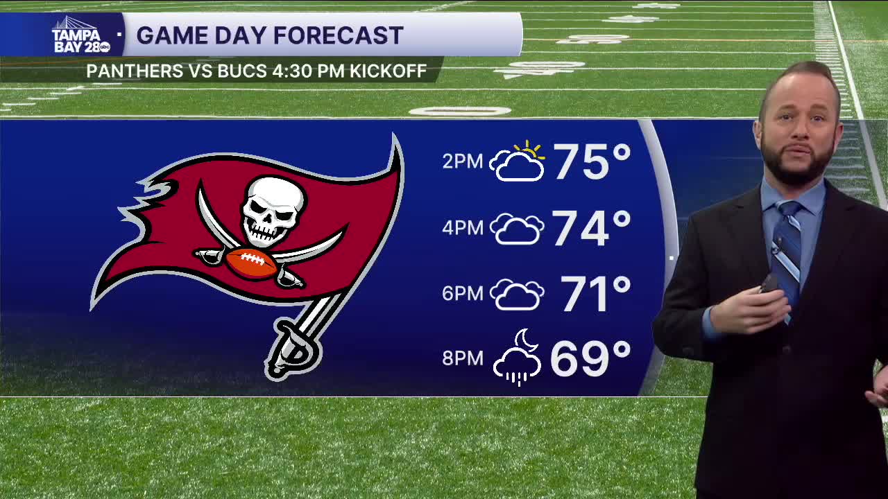 A weak cold front arrives tonight with a few showers and isolated t-storms. Most of the rain holds off until after the Bucs game, but a few showers may roll by, especially during the second half.