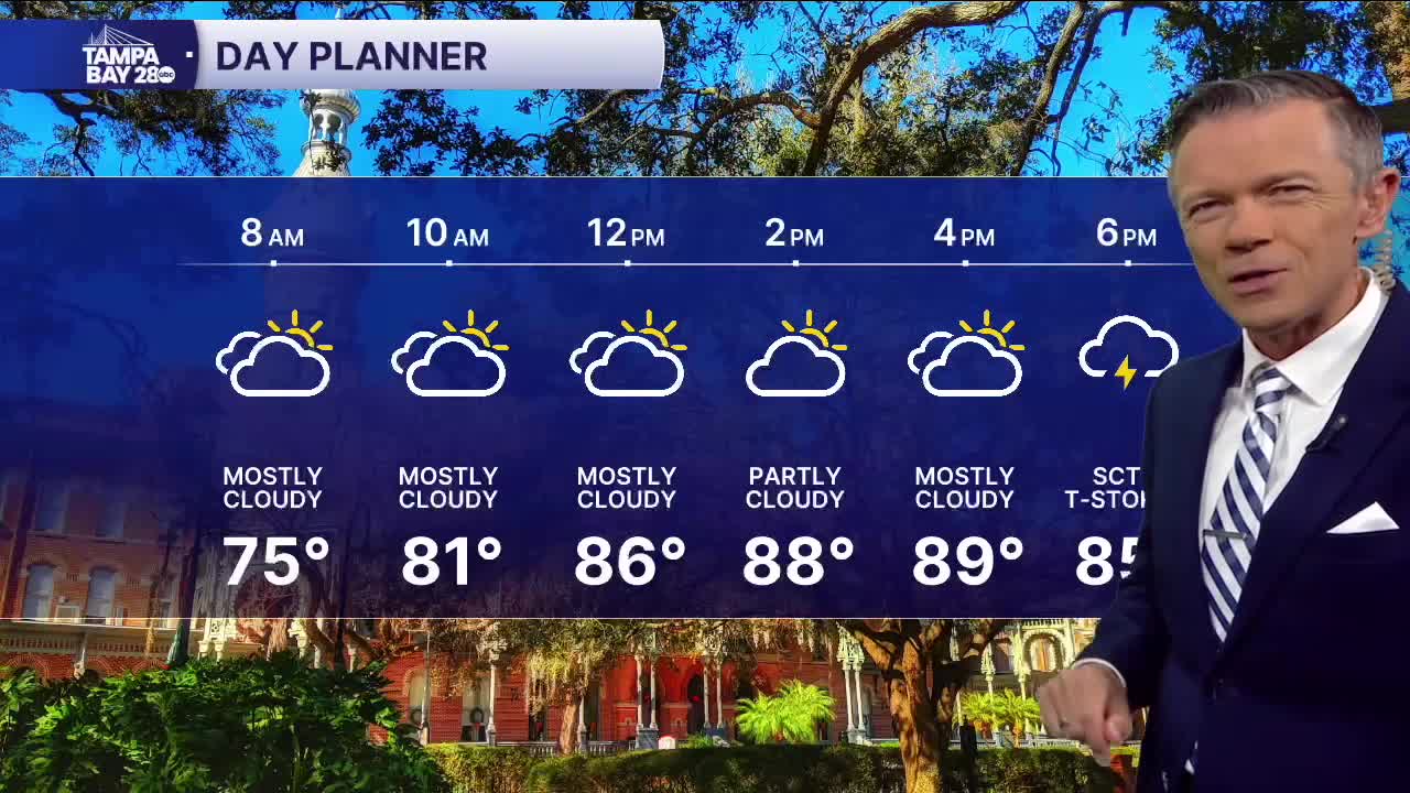 Skies will be partly to mostly cloudy this afternoon. This should keep temps a few degrees cooler than yesterday in most towns. Highs will reach near 90. We'll also see a few sct'd PM showers with most of the rain being east of I-75. Rain chances east will be around 30%.