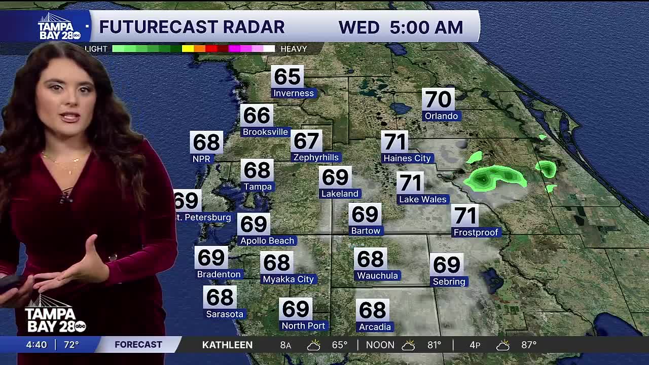 TAMPA — Good Tuesday morning Tampa Bay! It is a nice and mild start with mostly sunny skies. Some fog is also possible inland, but should subside by mid-morning. Throughout the day highs really warm up to almost near 90 degrees. A stray sprinkle can't be ruled out in the afternoon south of Tampa Bay. Wednesday kicks off a nicer and slightly milder trend with a weak cold front. This will drop highs to the mid-80s with lows in the 60s. Maybe even an upper 50 inland, and along the nature coast in the morning. Friday stays dry with winds gusting up to 20 mph. The weekend looks like the tail end could bring us our next rain chance. Highs still in the mid to upper 80s.