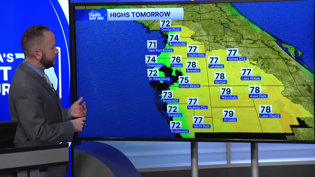 Lows will drop into the 30s and 40s Monday morning. By the afternoon, expect low to mid 70s I-75 west to the coast. Mid to upper 70s are likely inland.