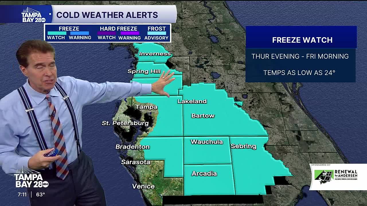 FLORIDA — Freeze Watch Thursday night into Friday morning. Temps could dip into the 20s inland.