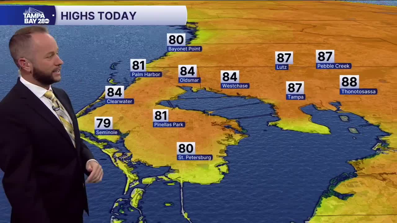 Expect partly cloudy skies today with highs in the low to mid 80s near the coast, with mid to upper 80s inland. A major cold front arrives tomorrow with an increasing chance of rain, and a major cool down behind it heading into next week.