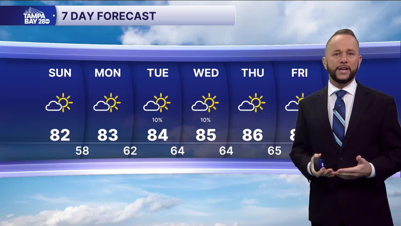 Tuesday, a cold front will move into North Florida, and it will bring a chance for a few showers and storms mainly north, but some of those storms could make it into the Nature Coast. The rest of the area will have a 10% chance Tuesday and Wednesday while northern spots could be as high as 40%.