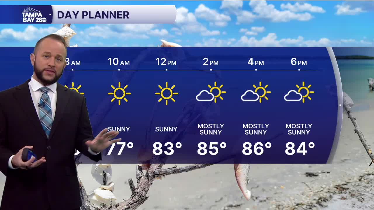 Today, expect partly cloudy skies with highs in the mid to upper 80s inland with low to mid 80s along the coast. The sea breeze will move inland after noon and may fire up a shower or storm east of I-75, but coverage will be very low.