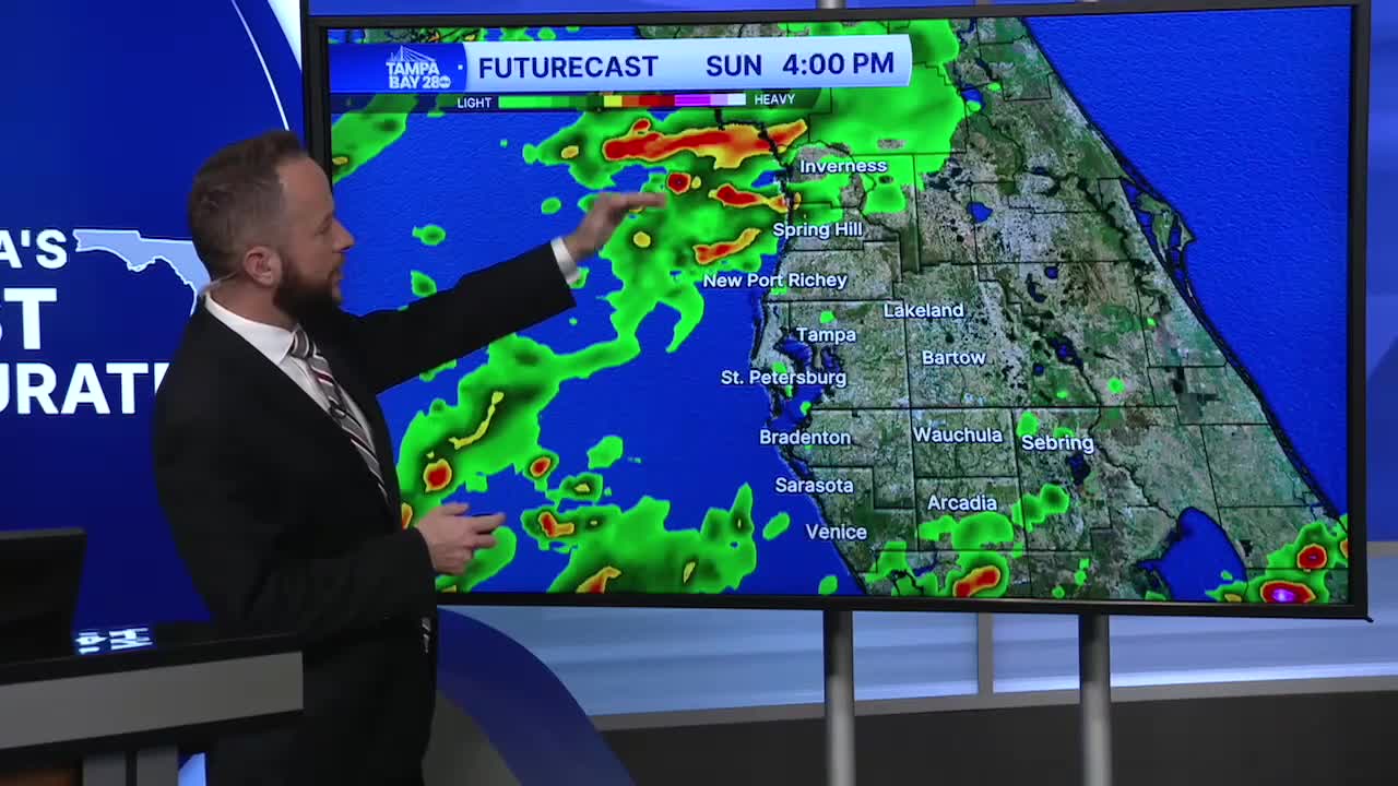 Expect a sunny start with warmer temps Sunday morning. Clouds increase Sunday afternoon with a few showers and storms moving in off the Gulf mainly north of I-4 after 3 p.m. Rain chances are at 40% north, with only 10-20% south.