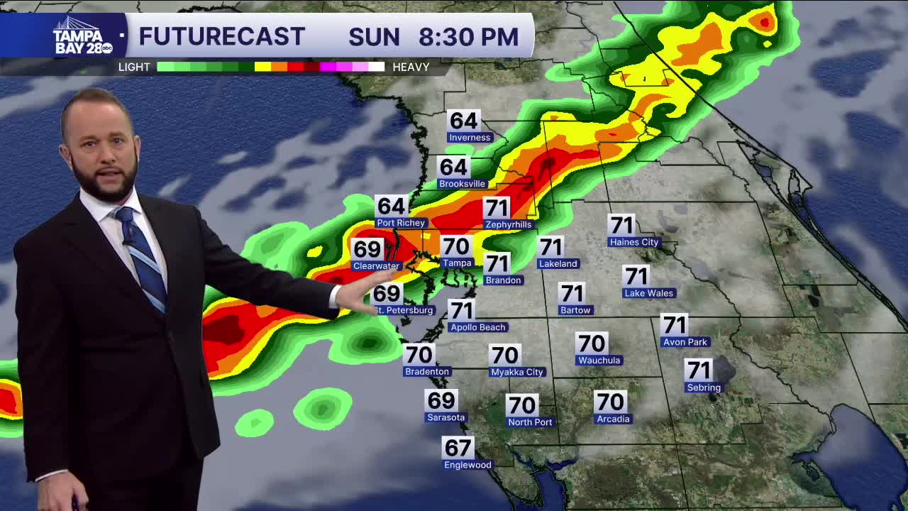 Rain chances begin to pick up after 4 p.m. The Nature Coast will see the rain first with the arrival between 4 and 7 p.m. Pinellas to Polk Co and along I-4 will see the rain arrival time between 5 and 8 p.m. South of Tampa Bay, the rain arrival time will be between 7 and 10 p.m.